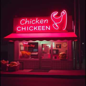 Chicken Cottage glow, neon signs blaze,