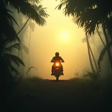 In the heart of the jungle, where shadows meet the dawn, A ghost rider Chases the day