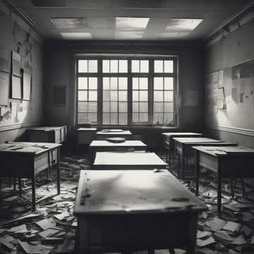 Desks overturned books on the ground