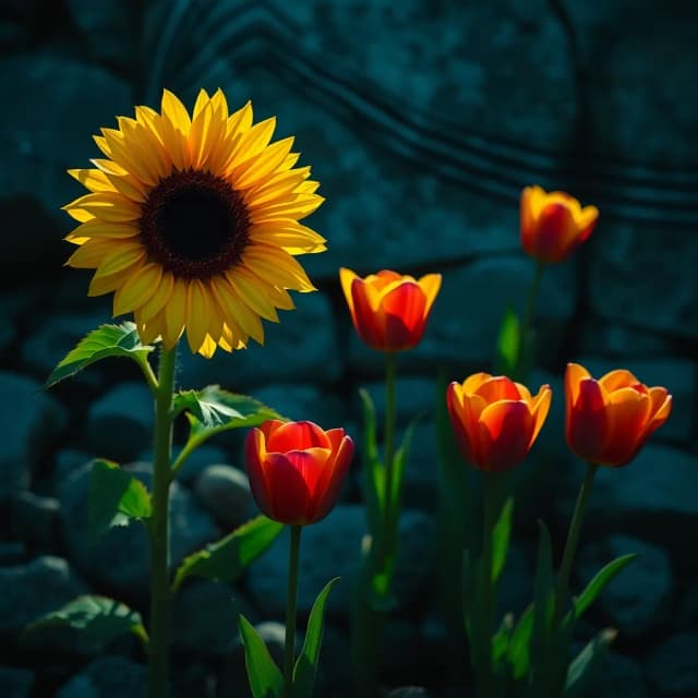 Esta girasol rodeada de tulipanes es un detalle para ti, Parati, mi esposa mi amada la mujer que siempre llevo en mi corazón, un regalo de Dios al verte sonreír soy el hombre más feliz, toma mi amor, toma mi mano, toma mi tiempo es para ti, no hay espacio para otra, contigo soy el hombre más feliz.